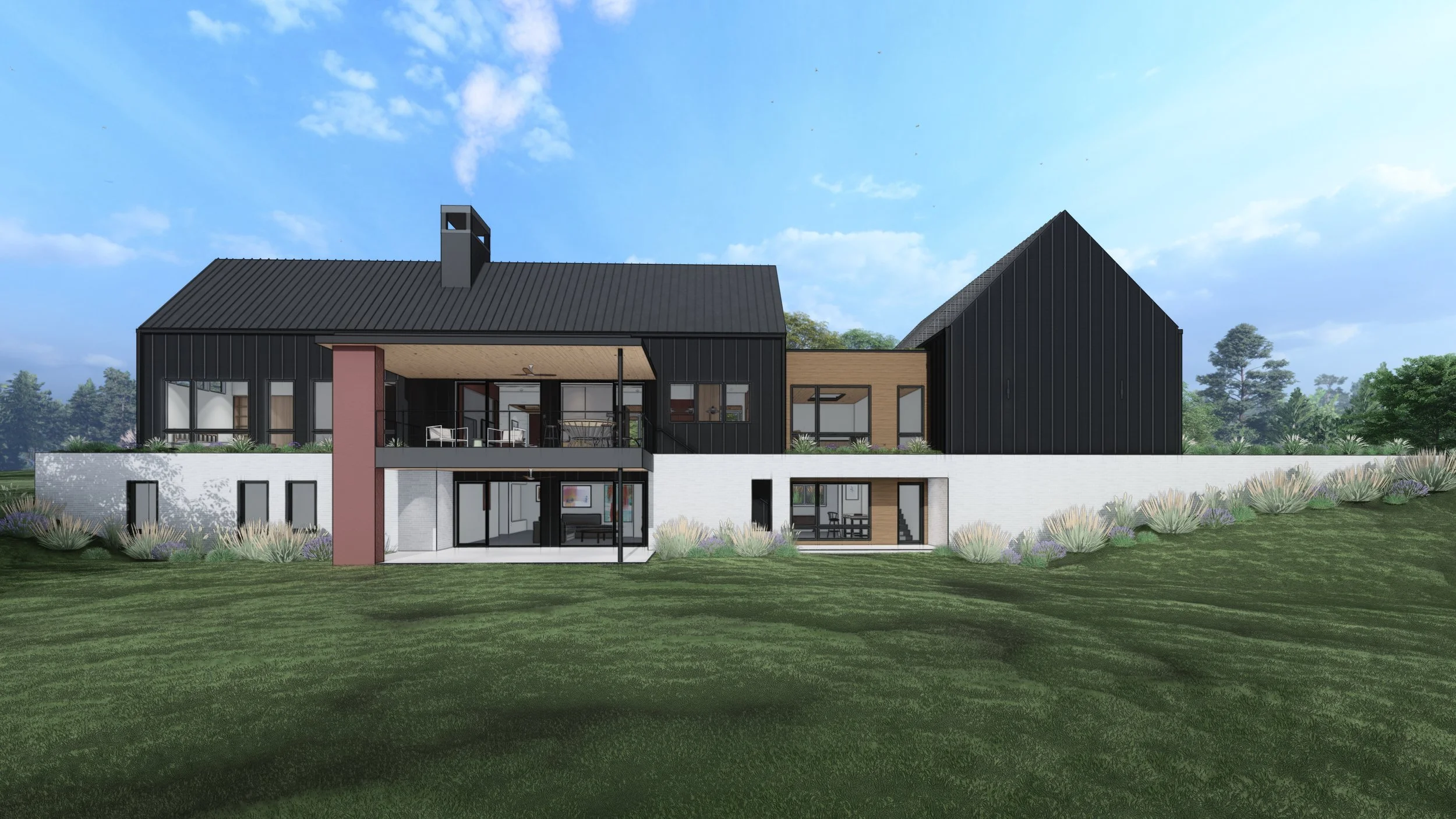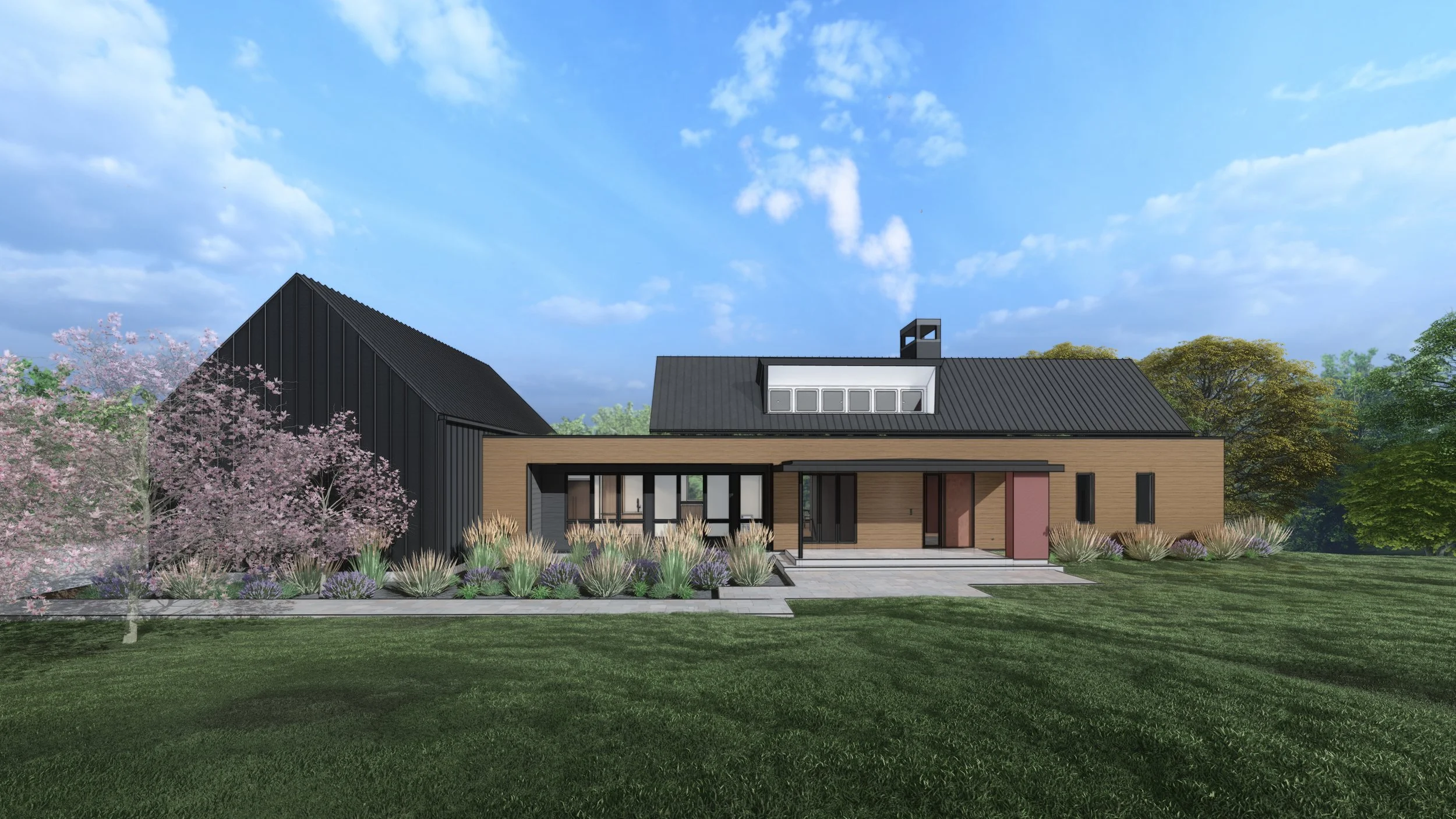The architectural composition is defined by two gabled volumes clad in black vertical siding, each serving a distinct living purpose. One gable houses utilitarian function such as parking, storage, and mechanical systems, while the other contains the primary living and gathering spaces. These volumes are connected by a low-sloped, pavilion-style structure clad in horizontal wooden nickel gap siding, acting as a central hub and transitional space.