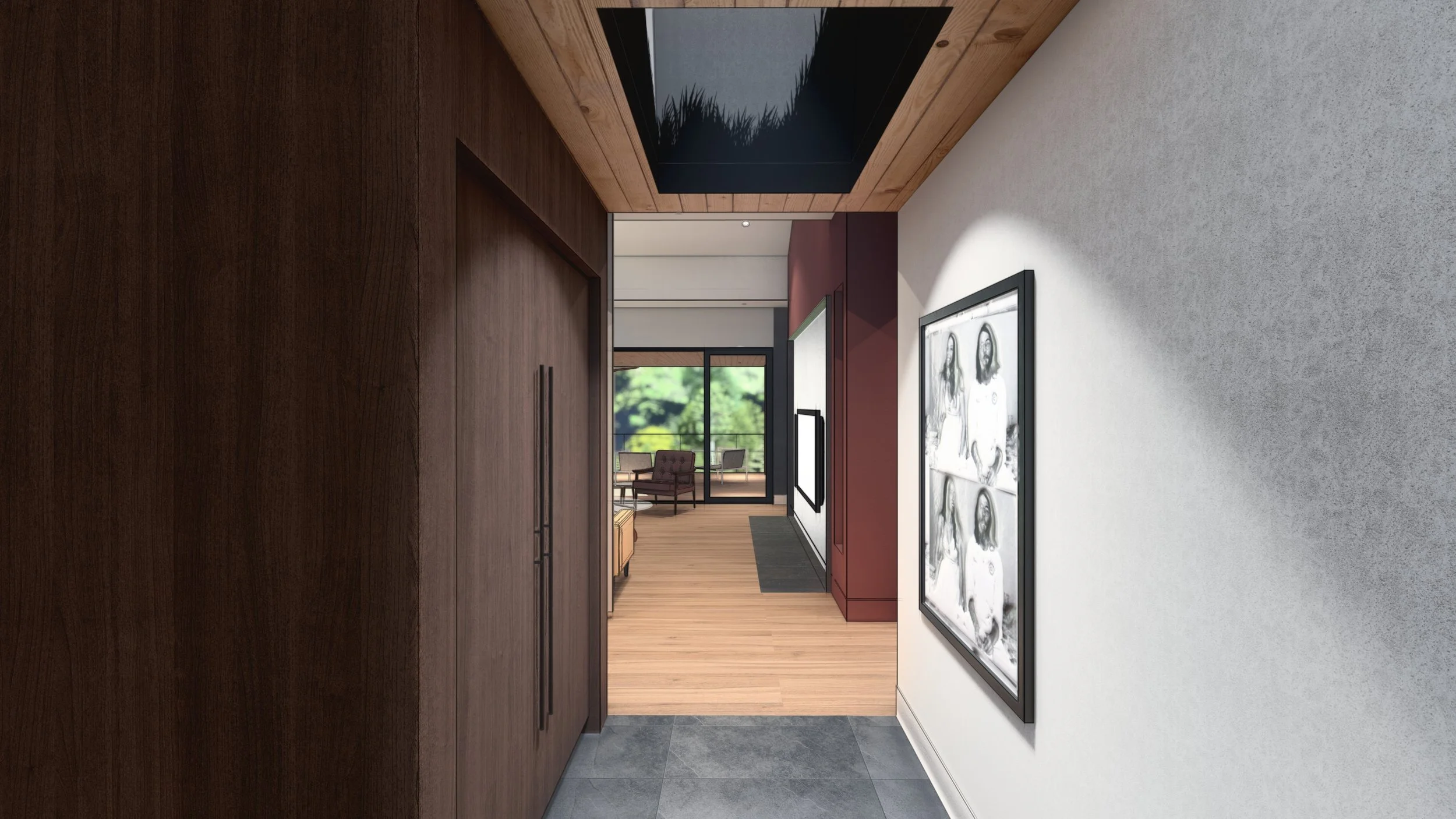 Anchoring the home to its site is a white masonry plinth of Norman modular brick, which extends into the landscape to form landscape retaining walls and terraces that address the site’s dramatic 20-foot elevation change at the home site. A key design move was the intentionally created void between the gables, forming a welcoming entry sequence that scales down from full gable heights to a more intimate human scale. Within the sequence, then entry at the connector begins with nine-foot ceilings and gradually opens up, guiding visitors through a spatial progression that is both functional and poetic.