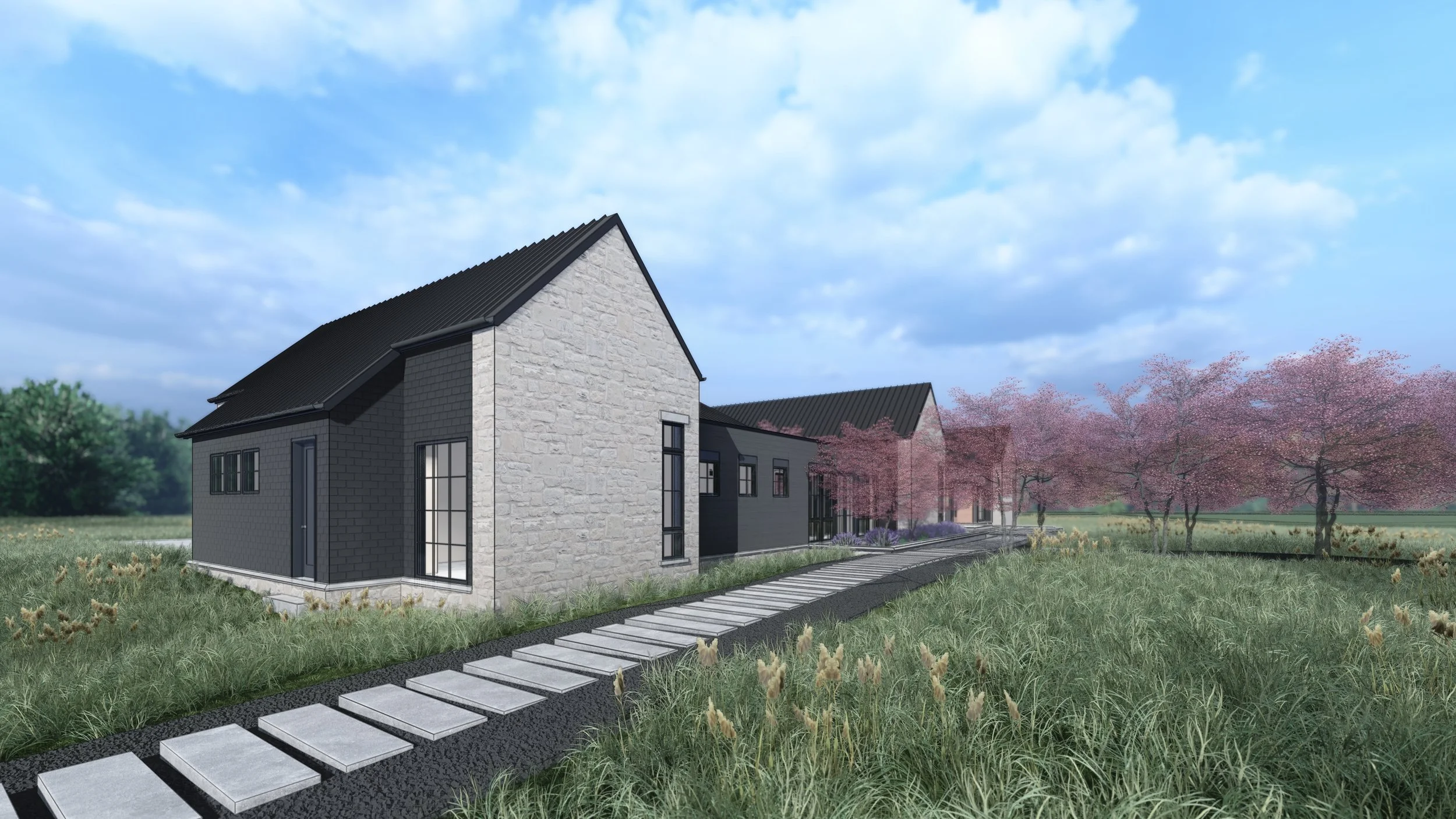 The site strategy was central to the design. Lawns were left to grow naturally, softening the edges of the built environment and reinforcing a sense of place. The architecture blends traditional farmhouse forms with contemporary connections with traditional materials and modern detailing. Three gabled volumes clad in slate shingles are anchored by limestone bookends, while a low-sloped roof structure clad in horizontal nickel gap siding connects the forms and creates a rhythmic architectural flow