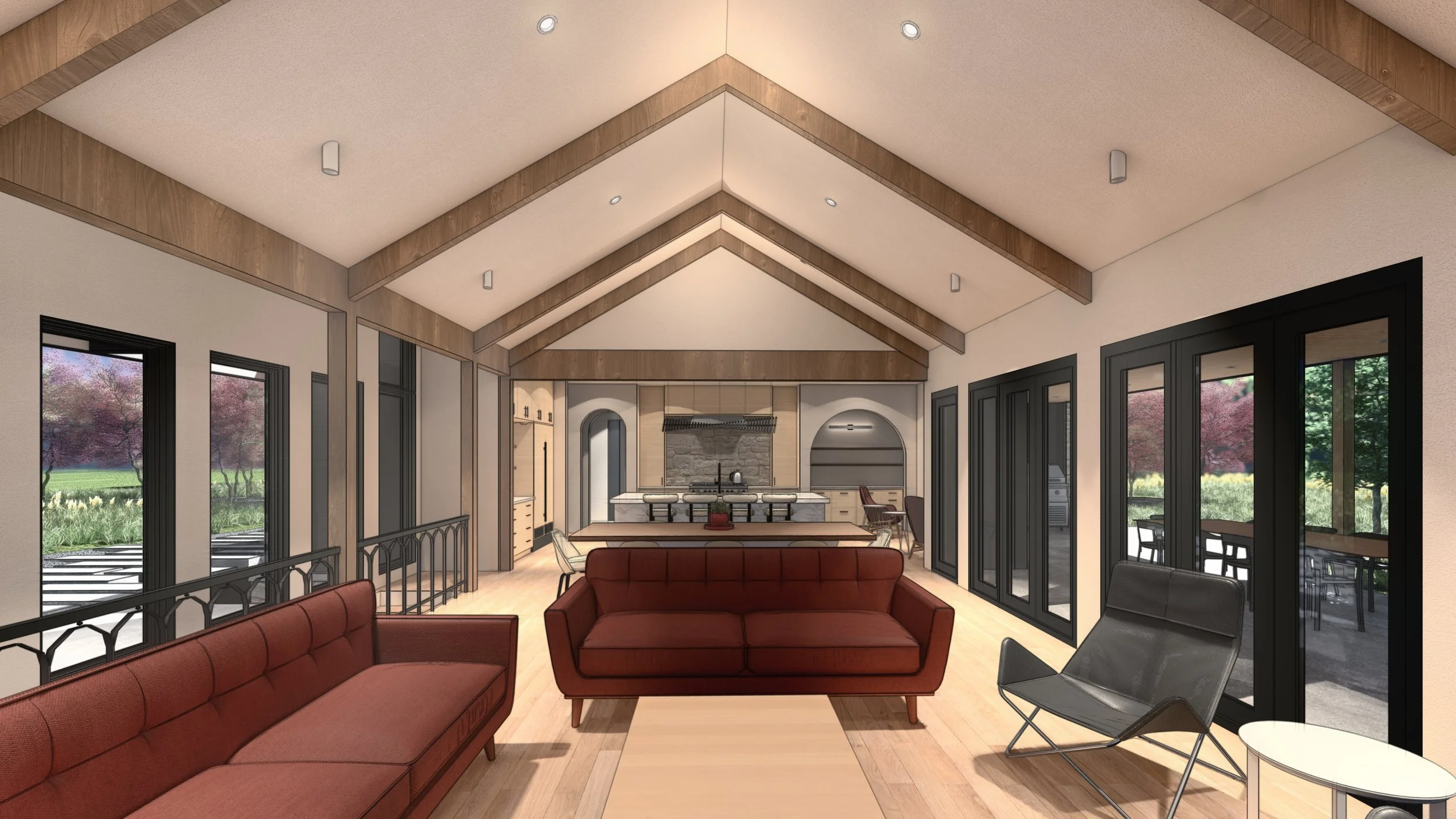 Set on twenty rolling acres, the clients sought a custom-designed home that would reinterpret the traditional farmhouse through a contemporary lens—creating an enduring and adaptable environment for a growing family. The opportunity was to design a residence that could serve as both a private retreat and a community gathering space, reflecting the rhythms of rural life and spiritual practice.